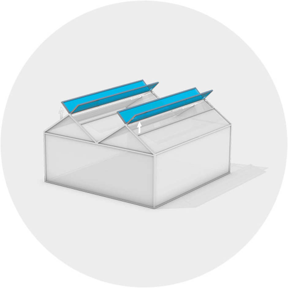 Aan weerszijden van het dak bevindt zich een doorlopende ventilatieklep in de richting van de nok. Continu ventileren is een continue ventilatiemethode waarbij over de gehele lengte van de kas ventilatieluiken worden geplaatst.